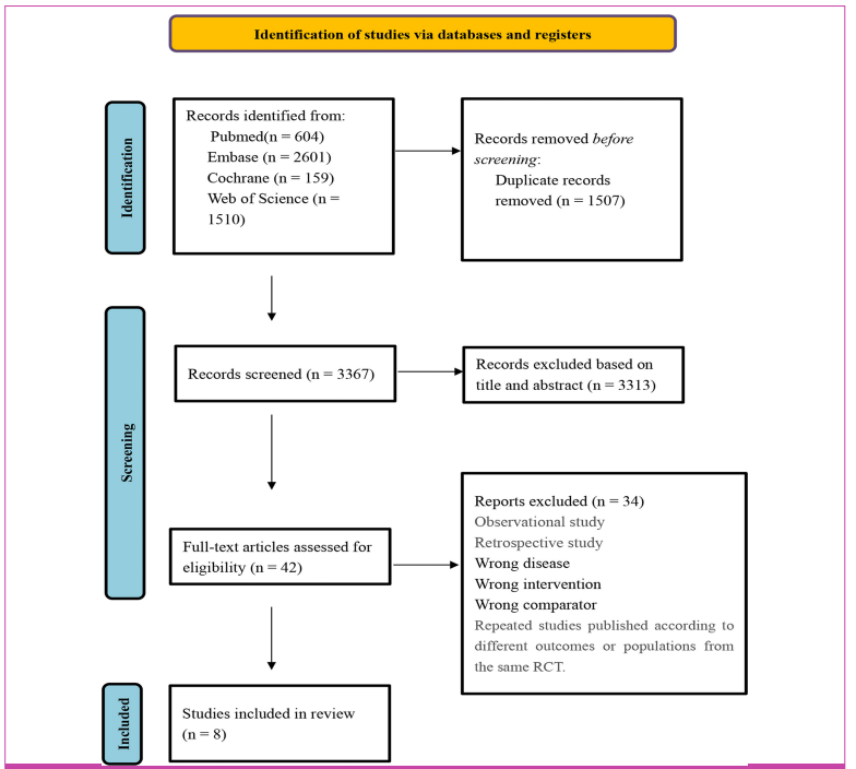 A preliminary search yielded 4874 relevant articles. After excluding 1507 duplicates, 42 articles were retained following title and abstract screening. Subsequently, 42 articles were subjected to full-text screening, resulting in the inclusion of 8 studies.[4,5,7,8,]The process of literature screening is illustrated in Figure 1.