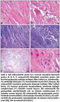 Işık mikroskobunda yapılan incelemede, normal menisküs grubunda belirgin lakünalar içinde büzüşmüş hücreler ve sıkı paketlenmiş kollajen lif yapısı izlendi. Matriksten kolaylıkla ayırt edilebilen oval ya da yuvarlak tek kondrositler görüldü. Kollajen lif demetleri homojen, düzenli ve ondülan yapıdaydı. Normal menisküsten alınan doku örnekleri geçirimli elektron mikroskobuyla incelendiğinde tüm örneklerdeki kollajen liflerin diziliminin homojen yapısı izlendi (Şekil 2A, 3A). Osteoartritli dizlerdeki menisküslerden alınan doku örneklerinde yapılan incelemede kollajen liflerde heterojen dizilim izlendi. Bazı alanlarda konsantrik fibröz demet lamellerinin organizasyonunda bozulmanın yanı sıra kalitatif olarak değerlendirildiğinde kollajen liflerin miktarında azalma vardı. Bazı lokal alanlarda son derece seyrek düzenlenmiş kollajen lifler izlendi (Şekil 2B, 3B). Her iki grupta toluidin mavisiyle boyanmış kesitler incelendiğinde hücreleri çevreleyen matriks alanında metakromazi görülen bölgeler belirlendi. Kontrol grubunda kondrositlerin etrafındaki metakromazi belirginken, osteoartritli dizlerden alınan menisküs grubunda sadece hücre proliferasyonu olan alanlarda metakromazi izlendi (Şekil 2C, 2D). Bu gruptaki tüm örneklerde, normal menisküs grubuyla karşılaştırıldığında kıkırdak hücrelerinde kalitatif olarak azalma varken, topografik gözlemlerde lokal hücre proliferasyon alanlarında kümeler yapmış hücreler ve dev kondromalar izlendi. Dev hücrelerin çevresinde bazofilik reaksiyonlar belirlendi (Şekil 2E, 2F, 3G). İnce yapı düzeyinde kontrol grubundaki kondrositler yüzeyindeki kısa uzantılar, organeller ve sitoplazmasındaki küçük lipid damlacıklarıyla olağan görünümde izlendi. Kondrositleri çevreleyen belirgin teritoriyal alan, kollajen lifler içeren matriksten kolayca ayırt edilebildi (Şekil 3C, 3D). Kontrol grubuyla karşılaştırıldığında osteoartritli dizlerdeki menisküs grubunda izlenen kondrositler daha oval ve ince uzundu. Teritoriyal matriks alanları bu grupta son derece seyrekti veya izlenemedi (Şekil 3F). Normal menisküslerdeki kondrositlerin sitoplazmasında izlenebilen küçük lipid damlacıklarının sayısı ve büyüklüğündeki artış osteoartritli dizlerdeki menisküs grubunda belirgindi (Şekil 3E). Bu grupta hücrelerarası alanda dev kalsifiye yapılar izlendi (Şekil 3H).