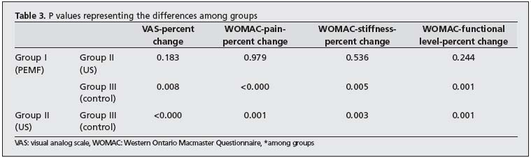 Material and Methods: Forty-five patients with knee osteoarthritis (mean age: 63.5±10.2 years) were randomly assigned to three groups. The first group received pulsed electromagnetic field therapy (frequency: 2 Hz, 100 Hz, 25 Hz consecutively, 35 minutes/ session), the second group received therapeutic US (frequency: 1 MHz, power: 1.5 watt/cm2 continuously, 10 minutes/session) and the third group served as the no- treatment control group. Evaluations were done at baseline and at the end of the treatment (third week). Assessment parameters were pain, stiffness and functional level scores of the Western Ontario and McMaster Universities (WOMAC) questionnaire and pain severity evaluated by Visual Analog Scale (VAS) (0-10).