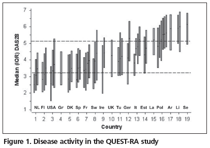 QUEST-RA is a unique multinational collaboration to review patients with RA for their clinical status and is therefore described here as an successful example of quantitative clinical measuring of RA as part of routine clinical care. QUEST-RA collects data from consecutive, unselected, patients with RA with no other selection criteria but adult-onset RA. Three or more clinics are invited in each country, to ensure generalizability of the data. In each clinic, 100 or more patients are assessed according to the SPERA evaluation described above. The primary aim of the QUEST-RA program is to provide “hands-on” experience to rheumatologists with patient questionnaires and standard clinical monitoring as part of usual care, in order to advance inclusion of quantitative data at every rheumatology visit.
