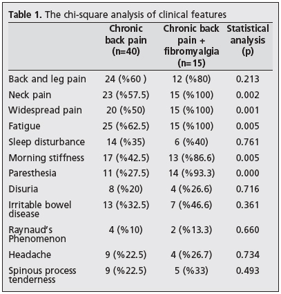 The first physician diagnosed 15 and second physician diagnosed 16 FMS patients within 55 patients. In the final analysis it was determined that 15 patients were common in both of the physicians' decisions. In one patient the number of tender points was varied and this patient was not accepted as FMS. The mean age of CLBP was 45.55±11.20 and FMS+ CLBP was 48.20±10.82. All of the patients with FMS+CLBP were females (p=0.04). Fatigue, morning stiffness, paresthesia, neck pain, and number of tender points were significantly higher in FMS+CLBP group (p=0.05, p=0.005, p=0.02, p=0.001, p=0.001, consecutively).