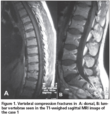 Compressive fractures were detected in nearly all lumbar and thoracic vertebras on magnetic resonance imaging (MRI), requested elsewhere before admission to our clinic; the fractures were most prominent in the lower thoracic and upper lumbar region (Figure 1). Bone mineral density (BMD) examination obtained with dual-energy X-ray absorbtiometry (DXA) (DXA-Lunar) revealed a 34% loss in the lumbar spine and 30% loss in the femoral region with respect to her age group (L2-4 Z-score -3.4, femur neck Z-score -2.4).