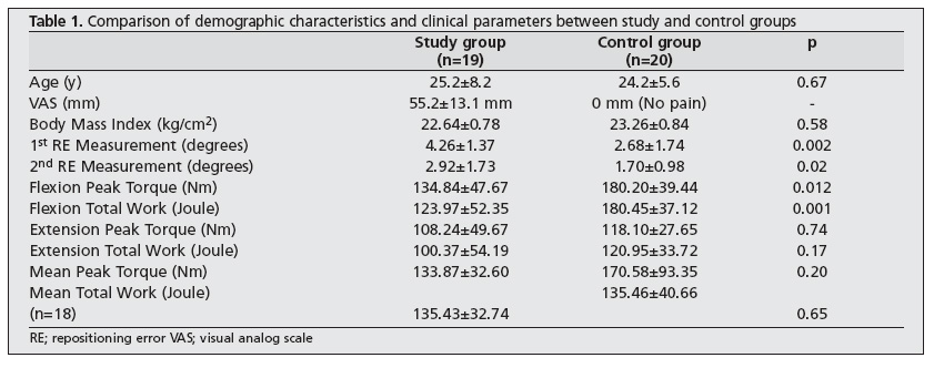 While differences in flexion peak torque and total work between the groups were statistically significant (p<0.05), differences in extension measures were not found significant (p>0.05). Besides, there were no significant differences in mean peak torque and mean total work between two groups (Table 1). Mean flexion peak torque angle was 51.66±8.7 degrees in study group and 61.4±6.9 degrees in control group. Mean extension peak torque angle was 41±11 in study group and 50.5±8.2 in control group. These differences were significant (p<0.05).