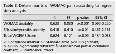 Linear regression analysis, in which the WOMAC pain score was the dependent variable and the others were independent variables, revealed that WOMAC disability, effusion, and total WORMS scores were significant determinants for the WOMAC pain score (p<0.001, p<0.01, and p<0.05, respectively; Table 3).