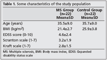 The MS group included 15 female and 7 male patients. The mean age of the MS patients was 35.5±9.0 years. The data including age, body mass index (BMI), EDSS scores, and ambulation and mobility scales are summarized in Table 1.