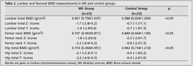 Materials and Methods: Twenty-two patients with MS (15 women, 7 men) and 22 age- and sex-matched subjects were enrolled into the study. Lumbar and femoral BMDs were measured using dual energy X-ray absorptiometry (DXA). Mobility and ambulation scales were also evaluated. Corticosteroid use was determined from an interviewer-administered questionnaire and patient records.