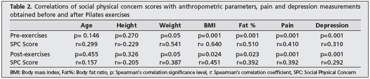 Materials and Methods: Twenty-five female patients with an age range of 33 to 63 years (mean: 49.16±7.51) were evaluated. All patients had been diagnosed with FMS according to the American College of Rheumatology (ACR) criteria. Patients underwent a Pilates exercise program consisting of one hour of exercise performed three times per week for 12 weeks. Prior to exercise and at the end of the 12th week, the patient's weight, grip strength of the hands, back strength, body fat ratio, and BMI were measured. Before- and after-exercise measurements were compared. The patient pain level was determined using the visual analog scale (VAS). Beck Depression Inventory (BDI) was used to define the depression level of patients. SPC level of patients was obtained by Social Physique Anxiety Scale (SPAS). The correlations between SPC scores and anthropometric values and pain and depression levels were evaluated.
