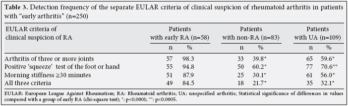 Analysis of the detection frequency of clinical suspicion criteria of RA proposed by EULAR (2002) in 250 patients with “early arthritis” at the start of the study showed that 102 (40.8%) patients had all three criteria, 60 (24%) had two criteria, 50 (20%) had one criterion, and 38 (15.2%) patients were without a single criterion, but had persistent arthritis/arthralgia for at least six weeks.