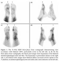 The characteristic appearance of the roentgenogram in CRPS is that of extensive mottled demineralization. The TPBS is valuable, particularly in mild or early cases of CRPS where roentgenograms of the extremities may be negative.[3] In our case, direct radiography showed the characteristic appearance only on the left foot, but the right foot appeared normal. In the early period when the right foot appeared normal on radiographs, the bilateral occurrence of CRPS was detected by the TPBS showing the mild or intense increased activity uptake in a dynamic, early blood pool, especially in delayed static images.[3,14] While symptoms of CRPS associated with LDH in the literature either begin or subside with a disc operation,[3-7,9] conservative measures relieved both the LDH and the CRPS in our case. The symptoms in our case resolved with medical therapy consisting of NSAIDs, calcitonin and gabapentin in addition to a rehabilitation program including exercise and physical therapy.