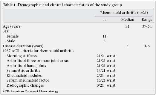 Patients and methods: Twenty-one wrists of 14 patients (11 females, 3 males; mean age 54 years; range 37 to 64 years) diagnosed with RA by clinical data and laboratory results were examined with MRI. The disease activity was determined by C-reactive protein and erythrocyte sedimentation rates. Wrist radiographies of all the patients were either normal or had suspicious signs. The presence of bone erosion was evaluated in 15 different regions (8 carpal bones, 5 metacarpal heads, 1 distal radius, and 1 distal ulna). Coronal and axial T1-weighted spin echo (SE) images with and without fat suppression, coronal T2-weighted turbo SE images with fat suppression, and coronal T1-weighted SE images with fat suppression following administration of intravenous gadopenteate dimeglumine were obtained.