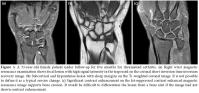 Conventional radiography of the wrist was acquired in the posteroanterior (PA) and semisupine projections. All the radiographs and MRIs were evaluated randomly and separately by a musculoskeletal system radiologist (GG with 6-year experience) at different times. Magnetic resonance imaging examination of the wrist was performed on both sides in six patients and on the dominant side in eight patients by a 1.5 Tesla MR (Magnetom Vision, Siemens, Medical Solutions, Erlangen, Germany) with surface coil. The examination site was 8 cm and set to encompass radioulnar, radiocarpal, midcarpal, and proximal metacarpal heads. Fat-suppressed and non-fat-supressed coronal and axial T1-weighted spin echo (SE) (TR 656 ms, TE 12 ms, slice thickness 3 mm, matrix 154x256, acquisitions 2), coronal fat-suppressed T2-weighted turbo spin echo (TSE) (TR 4000, TE 54, flip angle 180°, slice thickness 3 mm, matrix 140x256, acquisition 1) or coronal short inversion time inversion recovery (STIR) sequence (TR 5600, TE 30, TI 150, flip angle 180°, slice thickness 3 mm, matrix 140x256, acquisitions 2) and following delivery of 0.1 mmol/kg intravenous gadopentetate dimeglumine contrast agent, coronal fat-suppressed T1-weighted SE (TR 656 ms, TE 12 ms, slice thickness 3 mm, matrix 154x256, acquisitions 2) images, were acquired.