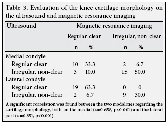 The mean medial and lateral femoral condylar cartilage thicknesses on the US were calculated as 2.1 mm on both sides, whereas MRI revealed 1.8 mm on the medial and 1.9 mm on the lateral part. The statistical analysis showed a significant difference in the condylar cartilage on the medial part (p=0.003). In total consideration, it was thicker (p<0.001) on US than MRI (Table 2). On the other hand, there was a statistically significant correlation between two modalities regarding the cartilage morphology, both on the medial (k=0.658, p<0.001) and the lateral part (k=0.851, p<0.001; Table 3).
