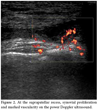 The US examination was performed first with the patient in a supine position in which the knee is flexed approximately 20-30 degrees while supported by a pillow, and the transducer was positioned longitudinally above the patella at the level of suprapatellar recess. The total synovial thickness and anteroposterior diameter of the suprapatellar bursa were measured. The synovial proliferation was considered positive when the total synovial thickness was above 3 mm, and the effusion was considered positive when it was 5 mm or higher (Figure 1a, b). During the longitudinal scan at the level of the suprapatellar recess, special attention was paid not to compress the recess. In the evaluation of the synovial proliferation, any presence of vascularization as a supporting evidence was evaluated with the color mode of the power Doppler US (Figure 2). However, because the study aimed to compare the B mode US findings and MRI findings and no contrast material was used in the MRI evaluations, spectral analyses and/or comparisons could not be made. In the same position, the patellar and quadriceps tendons were examined, and tendonitis was diagnosed if the thickness was increased and blurring and heterogeneous hypoechogenecity were differentiated.