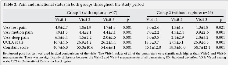 When we compared repeated measurements in each groups, visit-1 values of UCLA scale and Constant score were significantly lower than visit-2 and visit-3 measurements (p<0.001 for all comparisons); however, there was no significant difference between the visit-2 and visit-3 measurements (p>0.05 for all comparisons) (Table 2).