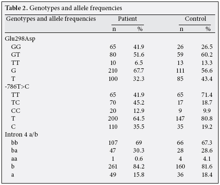 Patients and methods: One hundred and fifty-five unrelated patients (69 males, 86 females; mean age 40.5 years; range 14 to 66 years) and 98 healthy controls (43 males, 55 females; mean age 34.2 years; range 17 to 78 years) were examined for eNOS gene Glu298Asp, -786T>C and intron 4 a/b polymorphisms.