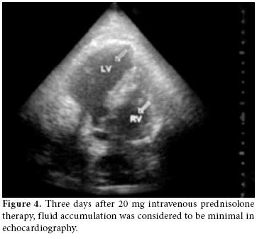 In high resolution computed tomography (HRCT) there was linear atelectasis, and fibrotic changes were found which were more pronounced in the upper lobes of both lungs (figure 2). Mild to severe pericardial effusion was seen in echocardiography (ECHO; figure 3). Three days after 20 mg intravenous prednisolone therapy, fluid accumulation was considered to be gradually decreasing in ECHO (figure 4).