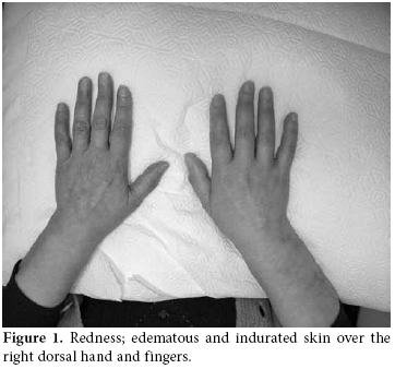 A physical examination of the patient revealed hyper-pigmented, macular lesions in the right C7 and C8 dermatomes and redness in the palm of the hand along with edematous and tautness of the skin at the right dorsal hand and fingers (figure 1). The entire hand was cold and damp, even though distal pulses were intact. The distal and proximal interphalangeal and metacarpophalangeal joints of the fingers and wrist were painful and reduced when range of motion (ROM) was tested. The ROM of the elbow and shoulder were normal.