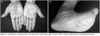 A 33-year-old man with a 13-year history of AS started on anti-TNF, adalimumab 40 mg every other week because of inadequate response to previous diseasemodifying anti-rheumatic drugs administered for the previous 12 months. He had a good response to anti-TNF treatment and no longer complained of morning stiffness and had a sustained score of less than 3 on the Bath Ankylosing Spondylitis Disease Activity Index (BASDAI). He suddenly developed pustular and erythematous skin lesions on his palms and soles at the 12th month of adalimumab treatment (figure 1). There was no history of previous skin lesions or allergic diseases and no family history of psoriasis. He had normal acute phase response and no clinical or laboratory evidence for infections including Chlamydia. The patient was referred for dermatology consultation, and a punch biopsy of the lesions demonstrated psoriasiform epidermal hyperplasia with acanthosis, hyperkeratosis and parakeratosis and intraepidermal pustulosis. A topical steroid was administered for the palmoplantar pustular psoriasis lesions which responded well and disappeared completely within a couple of weeks. In a follow up after two weeks, palmoplantar pustular psoriasis completely resolved with local treatments. Adalimumab was discontinued and the patient followed up with a meloxicam 15 mg daily treatment.