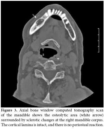 In September 2008, a 58-year-old female diagnosed with AS in 1973 was referred to Ege University Hospital, Department of Physical Medicine and Rehabilitation complaining of pain and discomfort in the right mandible. These symptoms had started in May 2008 following a tooth extraction. The extraction socket did not heal, even after eight weeks, despite antibiotherapy. Besides the pain and discomfort, she experienced the presence of some particles in the tooth extraction socket of her right mandible which were probably autogenous bone. A panoramic radiograph was taken 10 weeks later in July 2008 which revealed irregularity and diffuse sclerotic bone changes in the trabecular bone structure of the right mandible as well as a bony defect at the level of the extraction socket (Figure 1). A sample obtained from the exposed area was sent for culture to the microbiology laboratory due to the suspicion of dental infection/abscess. Oral flora microorganisms grew in the culture.
