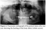 Together with the past history of long-term alendronate treatment and occurrence after tooth extraction, relevant clinical symptoms and conventional radiographic findings led to the suspicion of ONJ in this patient. We immediately ordered dental computed tomography (CT) which revealed sclerosis and osteolytic changes in the right mandible. This confirmed the diagnosis of osteonecrosis (Figures 2, 3). The patient also consulted with dental surgeons, and since there was no pathologic fracture, extra-oral fistulae, or osteolysis extending to the inferior border of the mandible, the disease was accepted to be in the second stage. Surgery was not recommended, and conservative management was started. The patient was advised to discontinue the alendronate treatment, and the etanercept treatment was also stopped. A good oral hygiene regimen using antibacterial tooth rinse was recommended. Her complaints and symptoms alleviated gradually. A control panoramic radiography taken after one year of bisphosphonate withdrawal displayed healing of the exposed bone (Figure 4).