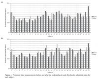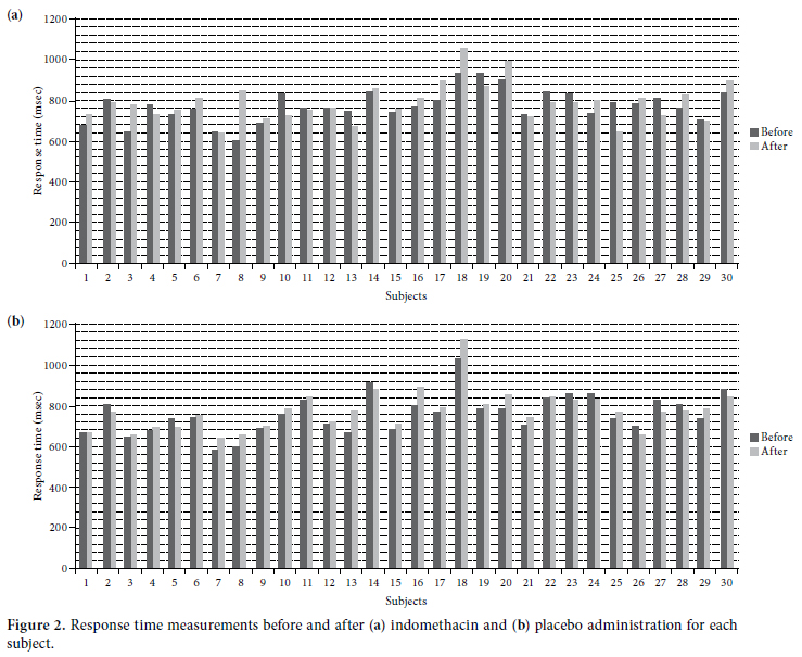The premotor reaction time measurements for the indomethacin and placebo administration for each subject are shown in Figure 1a and 1b, respectively. The response time measurements are also presented in Figure 2.