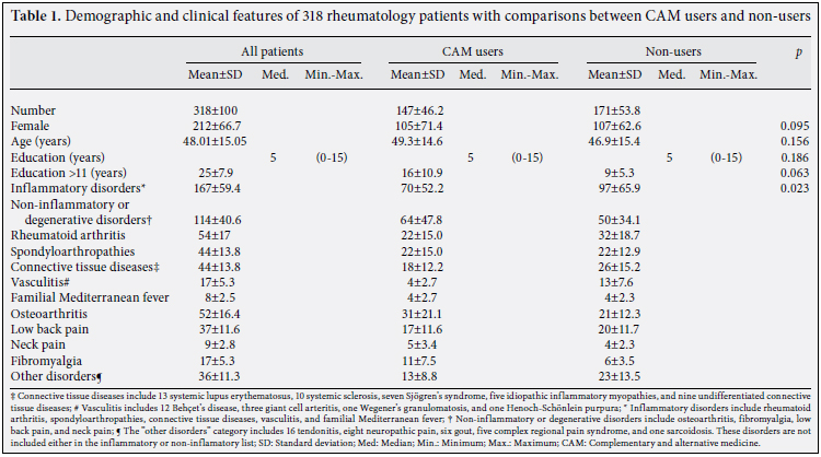 A total of 318 patients with rheumatic disorders completed the questionnaire. The demographic and clinical characteristics of the patients are summarized in Table 1. Approximately one half (46.2%) of the patients had experience with at least one type of CAM method. There was no difference in the frequency of CAM methods used among patients from the three different cities (data not shown). The mean age of CAM users and non-users was similar (p=0.156). There was no significant difference in terms of gender between CAM users and nonusers. However, the frequency of CAM use tended to be higher among females compared with males (50.5% versus 39.6%, respectively; p=0.095). Patients with a higher education level (more than 11 years of education) tended to use CAM more frequently than patients with a lower education level, but the difference did not reach a statistically significant level (64% and 44.7%, respectively; p=0.063). The patients with non-inflammatory or degenerative disorders, including osteoarthritis, fibromyalgia, chronic low back pain, and chronic neck pain, experienced CAM more frequently than the patients with inflammatory disorders, such as rheumatoid arthritis, spondyloarthropathies, connective tissue diseases, vasculitis, and familial Mediterranean fever (p=0.023).