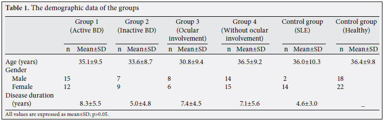 The demographic properties of the groups are shown in Table 1. There were no statistically significant differences between the BD, SLE, and healthy groups regarding age and disease duration (p>0.05). No difference was found between the patients with BD and the healthy group with regard to gender except that patients with SLE were predominantly female (2 males versus 14 females, p<0.05). The patients with BD had a mean age of 34.4±9.6 years (range 18 to 51 years) and a mean disease duration of 7.1±5.4 years (range 1 to 20 years).