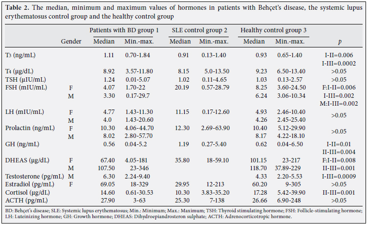 The follicle-stimulating hormone, LH, prolactin, and DHEAS measurements were evaluated separately in the male and female patients, and the SLE patient levels of these hormones were studied only in females. Triiodothyronin, T4, TSH, basal cortisol, basal ACTH, and GH were studied in all patients, but estradiol was studied only in females and testosterone only in males. The hormone levels of BD, SLE, and the healthy groups are presented in Table 2.