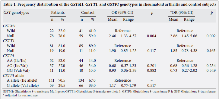 Results: The null genotype of GSTM1 was significantly higher in the patients with RA (78.0%) than in the control group (59.0%), and there was a risk factor for susceptibility to RA (OR=2.86, 95% CI=1.45-5.66, p=0.002). However, no significant difference was observed in the null genotype of GSTT1 among RA patients and healthy subjects (19% and 11%, respectively). There was no difference in the frequency distribution of the GSTP1 Ile105Val polymorphism between the groups (chi-square=1.69, p=0.429).