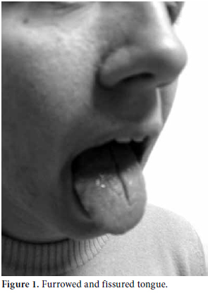 A 23-year-old, right-handed female was admitted to our outpatient neurology clinic with recurrent peripheral facial palsy that took place three times a year. She was suffering from hair loss and had a history of oral aphthous ulcers that relapsed once a year. She had no remarkable family history of any rheumatoid disease. On physical examination, her general condition was good, and she had no oral or genital aphthous ulcers or lesions. There were bilateral, macular, hyperpigmented annular plaques located approximately 10 cm proximal to the distal leg, laterally. She had mild orofacial edema at the left side of the upper lip and malar region beginning from the upper eyelid. In addition, she had a furrowed and fissured tongue (Figure 1). Her neurological examination was normal except for left peripheral facial palsy with orofacial edema (Figure 2). Cranial magnetic resonance imaging (MRI) and angiography were normal. Laboratory investigations, including complete blood count (CBC), liver and kidney thyroid function tests, an electrolytes test, and thyroid function tests, showed no abnormalites, and serum vitamin B12, IgE and amylase levels were normal. The antinuclear antibody (ANA) test showed a homogenous pattern, and three were positive in the nucleolar pattern. Moreover, an extractable nuclear antigens (ENA) profile was nucleosome 1 positive. Tests for anti-neutrophil cytoplasmic antibody (ANCA) and anti-cardiolipin antibodies (IgM and IgG) with anti-DNA antibodies were negative. Components of the complement cascade, such as C4, were decreased (13.50; normal range 15-50), whereas C3 was normal (119; normal range 85-200). There were heterozygote mutations in Factor V Leiden, plasminogen activator inhibitor-1 (PAI-1) 5G-4G, and angiotensin-converting enzyme (ACE) insertion/deletion (I/D). We treated the patient with 1 mg/kg/day oral prednisolone at 60 mg/day for five days, which was reduced to 50 mg/day for five additional days. Thereafter the dosage was reduced by 10 mg per week. Currently, the patient is still under the care of our outpatient neurology clinic as she is being monitored via follow-up visits.