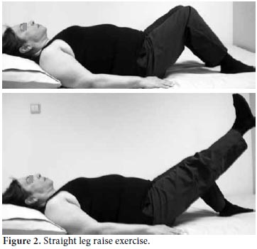 The program, which featured SLRE and MSE, was prepared according to a study conducted by Bakhtiary and Fatemi[17] Patients in the SLRE group did these exercises for three weeks (20 times twice daily) with an extended knee. The number of exercises was increased by five every two days so that by the end of the program (day 15), the subjects were performing 55 SLRE twice a day. To perform these exercises, the subjects were in a supine position with their hip and knee flexed in both extremities while the soles of their feet were on the treatment table. They were asked to extend one leg and hold it with an extended knee until 45° hip flexion for threefour seconds. Then they let it down for a three-four second rest (Figure 2).