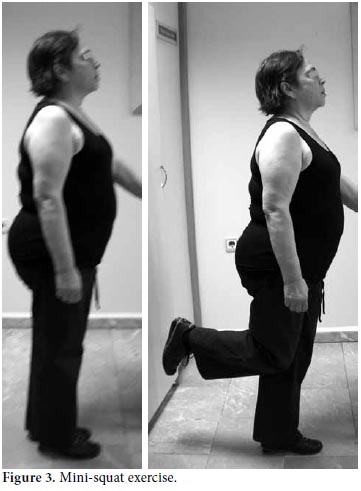 The patients in the MSE group also followed an exercise program for three weeks (20 times twice daily). The increase in the exercise routine was conducted in the same way as the other group so that by the end of the program (day 15), the participants were performing 55 mini-squats twice a day. To perform the mini-squats, the subjects were asked to stand on the lower extremity to be exercised and hold onto a stable surface using their hands. Meanwhile the other lower extremity was in 90° hip and knee flexion. The subject was then ordered to flex the extended knee 15-20° and hold this position for threefour seconds. Then they brought it to full extension and remained in that position for a three-four second rest (Figure 3).