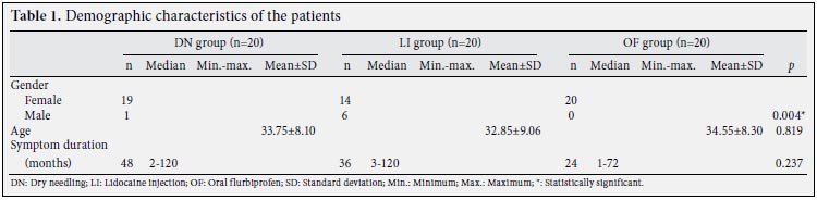 The number of active trigger points was between one and six in all the groups. In the LI group, the median number of active trigger points was three, whereas it was two in the DN and oral flurbiprofen groups. The groups were similar in terms of the number of active trigger points, (p=0.67) and these were localized at the trapezius, supraspinatus, and rhomboideus muscles. There were not similarities in terms of the muscles involved. This difference was also ignored because the muscle that is involved is not a factor that influences treatment response. The distributions of the trigger points to the muscles are given in Table 6.