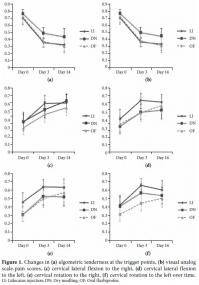 There were no restrictions of movement that involved neck flexion and extensions or shoulder movements in all directions in any of the patients. In all groups, the pre-treatment algometric sensitivity and VAS-pain scores decreased and the degree of neck lateral flexion and rotation significantly increased on the third and 14th days of follow-up. The quality of life was also significantly improved at the first and second controls. (Figure 1 and 2; Tables 4 and 5) These results showed that the DN, LI, and oral flurbiprofen were efficient in the treatment of MPS.