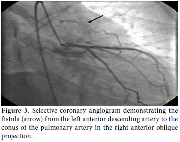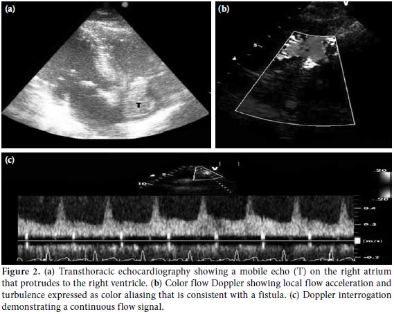 A 29-year-old male patient with BD was admitted to our clinic with dyspnea, palpitations, and chest pain. The diagnosis had been established three years earlier on the basis of mucocutaneous lesions and gastrointestinal disorders. The patient had then been treated with colchicine and corticosteroids. His past medical history also included deep venous thrombosis (DVT) in his calf. On his physical examination, a left parasternal murmur resembling the sound of a machine was detected along with abdominal ascites. His electrocardiography (ECG) and chest X-ray results were normal. Post-contrast thoracic computed tomography (CT) revealed right pulmonary effusion and decreased calibration together with a filling defect of the left inferior pulmonary artery due to a chronic PE (Figure 1a). On the abdominal ultrasononography, hepatic venous thrombosis was detected. The portal venous system was patent, but no enhancement was detected in the hepatic veins or proximal inferior vena cava (IVA) on the abdominal CT. The findings were concordant with BCS (Figure 1a). Two-dimensional transthoracic echocardiography revealed a mass on the right atrium protruding into the right ventricle (Figure 2a). The suprasternal view showed a turbulent and abnormal flow surrounding the arcus aorta and pulmonary artery (Figure 2b). Doppler interrogation demonstrated a continuous flow signal at that location. In addition, coronary angiography was performed to evaluate coronary involvement because of intractable angina pectoris, and a coronary arteryto- pulmonary artery fistula was detected arising from the left coronary artery (LCA) (Figure 3). On cardiac catheterization and oximetry study, there was a 5% step-up between the right ventricle and distal pulmonary artery, and the left-to-right shunt was 1.3. Since there was no evidence of a significant shunt, the fistula was not thought to be the cause of the angina, and the patient did not undergo corrective intervention. During the sixth month of treatment with colchicine, methylprednisolone, cyclophosphamide, and heparin, thoracic CT revealed complete lysis of the pulmonary thrombosis and ICT.