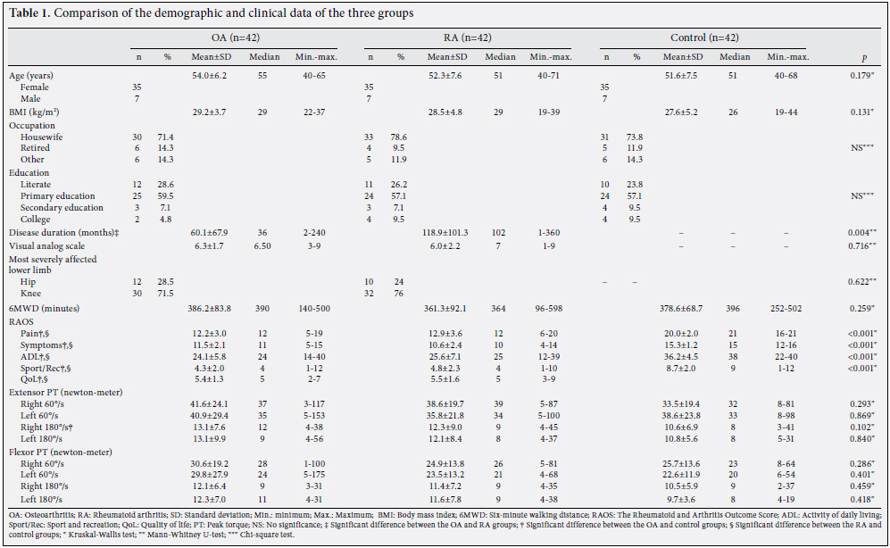 Patients and methods: A total of 126 subjects including 42 with OA in the lower limbs, 42 with rheumatoid arthritis (RA) and 42 healthy controls (mean age 52.65±7.17 years; range 40 to 71 years) were enrolled. The lower limb pain of the patients was evaluated using the visual analog scale (VAS). All participants underwent an isokinetic knee muscle strength test, a six-minute walking test (6MWT), and the Rheumatoid and Arthritis Outcome Scale (RAOS). The disease activity scores involving 28 joints (DAS 28) of RA patients and the Kellgren-Lawrence scores of OA patients were recorded.
