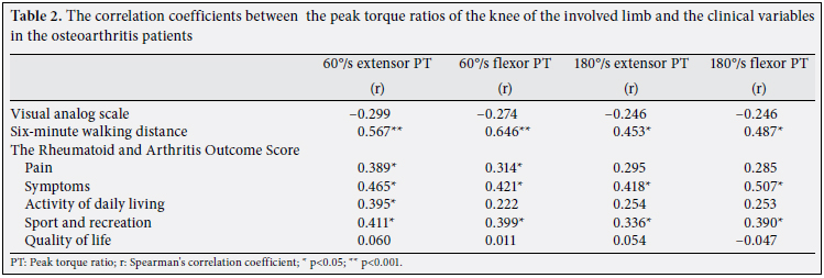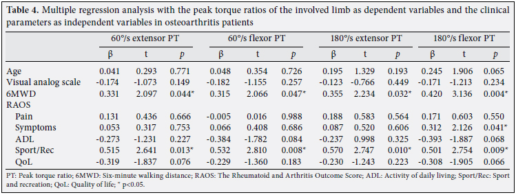 The results of a correlation analysis between the PT values of the knee of the involved limb (or the most painful limb in patients with more than one joint involvement) and the clinical parameters in OA patients are shown in Table 2. The VAS pain score showed no connection to any of the PT ratios (p>0.05) (Table 2), but there were positive correlations between the 6MWD and PT ratios of knee flexion and extension at 60°/s and at 180°/s (Table 2). Additionally, when a comparison was made between the PT ratios of the knee versus the RAOS subscales in the patients with OA, we found a positive correlation between the PT ratios of knee extension at 60°/s and all of the RAOS subscales except for QoL (Table 2). We also found that these ratios was positively correlated with the pain, symptom, and Sport/Rec subscales (p<0.05) (Table 2) and that the PT ratios of knee flexion and extension at 180°/s were positively correlated with the symptom and Sport/Rec subscales (p<0.05) (Table 2.