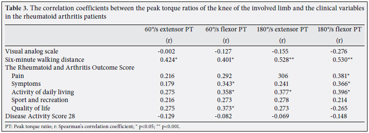 The correlation coefficients between the PT ratios of the knee of the involved limb (or the most painful limb in patients with more than one joint involvement) and the clinical parameters in RA patients are shown in Table 3. No correlations were identified between the PT ratios of knee extension and flexion at both velocities and the VAS pain score (p>0.05) (Table 3), but the 6MWD was positively correlated with all of the PT ratios of the knee of the affected limb (Table 3). There was also no correlation between the PT ratios of knee extension at 60°/s and the RAOS subscales (p>0.05) (Table 3), and the same ratios were positively correlated with the symptom, ADL, and QoL subscales (p<0.05) (Table 3). Furthermore, the PT ratios of knee extension at 180°/s were positively correlated with the pain and ADL subscales while the PT ratios of knee flexion at 180°/s were positively correlated with the pain, symptom, and ADL subscales (p<0.05) (Table 3).
