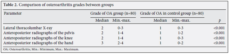 Although not symptomatic, radiographic OA was detected in the control group. Therefore, both groups were compared with regard to OA grades, and these were higher in the OA group than the control group and were statistically significant (p<0.05) (Table 2).