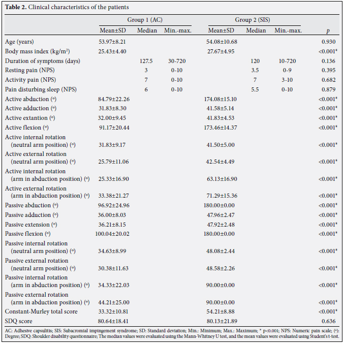 The patient's other characteristics are shown in Table 2. No significant differences were found between the groups in terms of age, shoulder pain, and symptom duration. However, a significant difference was observed in the two groups (p<0.001) when comparing the shoulder ROM. The ROM was markedly preserved in the SIS group but considerably limited in the AC group in all directions. In line with this, the total score for the Constant-Murley functional evaluation scale was significantly higher in the SIS group compared with the AC group (p<0.001), but no significant differences were noted between the total SDQ scores (p>0.05).