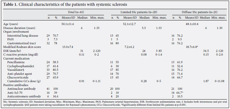 The clinical characteristics of the patients with SSc are shown in Table 1. Twenty patients (48.8%) had limited SSc while 21 (51.2%) had diffuse SSc. The mean age of SSc patients was 50.1 years, and the median disease duration was six years. The majority of the patients had ILD on HRCT and gastrointestinal involvement. No differences in the percentages of ILD, PAH, and gastrointestinal involvement were observed between the limited and diffuse SSc patients. The mean mRSS for all of the SSc patients was 13, but the mRSS was significantly higher in the diffuse SSc patients (p<0.001). While the proportion of the subjects who were taking GCs was similar between the limited and diffuse SSc patients, the cumulative GC dosage tended to be higher in the diffuse SSc patients (p=0.057). Antinuclear antibodies were present in all of the patients, and the proportion of patients with positive anti-SCL-70 was significantly higher in the diffuse SSc patients than in those with limited SSc (p<0.001). However, there was no difference in the percentage of ACA positivity between the limited and diffuse SSc patients.