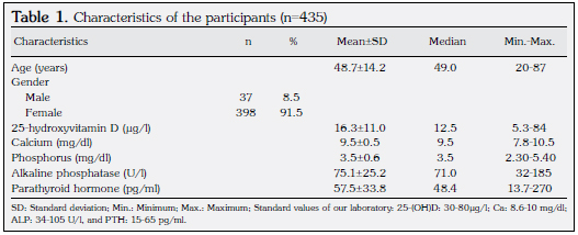 In this study, we analyzed 435 samples (262 winter samples and 173 summer samples). The patients ranged between 20 and 87 years of age (mean 48.72±14.22), and the mean 25-(OH)D status was 16.25±10.98 μ/l. The serum calcium was measured, and the median adjusted calcium was 9.47 mg/dl (range 7.8-10.5 mg/dl). The characteristics of our samples are shown in Table 1.