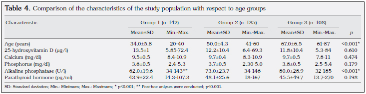 However, we detected no significant differences in the levels of 25-(OH)D between the age groups. Table 4 gives a comparison of the mean scores of characteristics of the study population with respect to age.