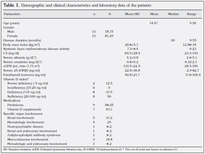 Patients and methods: A total of 16 children (13 girls and 3 boys; mean age 14.47 years; range 5-18) with SLE who were under followup in our clinic were included in this study. The medical records of the children along with the demographic data, disease duration, treatments received, disease activity, and 25-hydroxyvitamin D [25-(OH)D] levels were evaluated. Systemic lupus erythematosus disease activity (SLEDAI) scores were calculated on the day the serum samples were drawn.