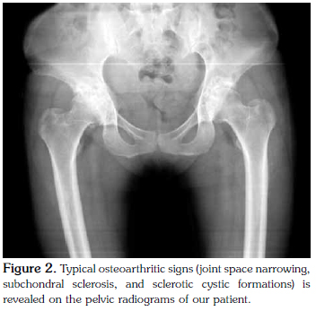 A physical examination revealed decreased ROM in both wrists and the MCP joints with accompanying flexion deformities; however, the affected joints did not demonstrate any signs of active inflammation. Furthermore, the patient's hip joint movements were painful and restricted. Typical signs of osteoarthritis (OA) (irregular narrowing of joint spaces, subchondral sclerosis, and sclerotic cyst formation) were seen on hand radiograms (Figure 1). Strikingly, the distal interphalangeal (DIP) and PIP joints were intact, and hook-like osteophytic formations on the heads of the metacarpal bones were seen, which is typical of hemochromatosis. Pelvic radiograms revealed irregular joint space narrowing, sclerotic changes, and subchondral cysts involving the hip joints (Figure 2). Additionally, the laboratory findings showed a normal erythrocyte sedimentation rate (ESR) and C-reactive protein (CRP) levels, and the patient tested negative for rheumatoid factor (RF) as well as anti-cyclic citrullinated peptide (anti-CCP) and antinuclear antibodies (ANA). Furthermore, the serum uric acid level was normal, and the liver function test results were within normal limits. Although the serum iron and ferritin levels were also within normal limits, the transferrin saturation rate was higher (69.71%) than normal (<55%). Moreover, the patient's estimated hepatic iron concentration was 44±20 μmol/g (normal <36 μmol/g) using T2 sequences in abdominal magnetic resonance imaging (MRI). A genetic examination also determined the existence of a homozygous H63D mutation; therefore, the patient was diagnosed with HH based on the clinical, radiological, and laboratory findings.