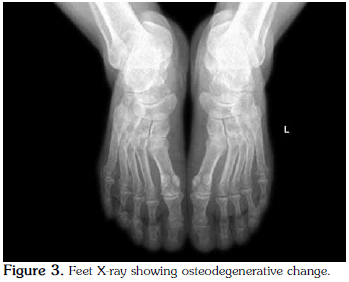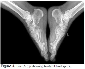 The bilateral knee radiographs of the patient were normal (Figure 2), but those of the feet revealed osteodegenerative changes (Figure 3) and bilateral heel spurs (Figure 4).