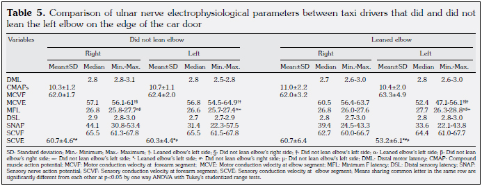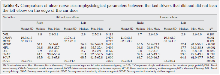 Results: Left side motor and sensory nerve conduction velocities at the elbow segment of the ulnar nerve were significantly decreased, while F latency of the ulnar nerve was significantly prolonged in taxi drivers. Motor and sensory conduction velocity over both left and right ulnar nerve at the elbow segment were significantly decreased, while F latency of the ulnar nerve was significantly prolonged in the taxi drivers compared to the control group. Ulnar nerve conduction parameters and F latency on both sides were statistically similar in the non-leaning group of taxi drivers; however, motor and sensory conduction studies over the left side of the ulnar nerve elbow segment were slower and F latency was longer in the leaning group of taxi drivers, compared to the right side and to the non-leaning group of taxi drivers.