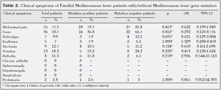 Seventy-one patients diagnosed as having FMF according to the Tel-Hashomer criteria were evaluated, considering 12 clinical symptoms. The prevalence of symptoms, from the highest to the lowest, were abdominal pain (77.5%), fever (50.7%), vomiting (18.3%), nausea (12.7%), arthritis (11.3%), arthralgia (9.9%), erythema (7%) and proteinuria (2.8%). Chronic arthritis, splenomegaly, hepatomegaly and amyloidosis symptoms were not detected in the patients (Table 2).