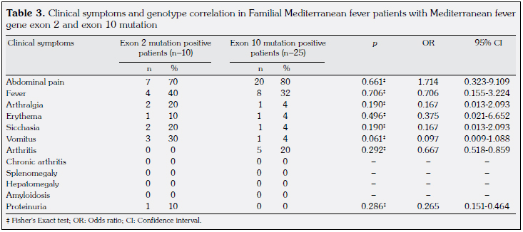 Patients who had MEFV mutation in exon 2 (n=10) and patients with MEFV mutation in exon 10 (n=25) were evaluated considering 12 clinical symptoms; however, the difference was not statistically significant (p>0.05), (Table 3).