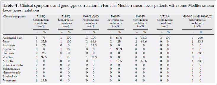 The relationship between some of the MEFV gene mutations found in patients and 12 clinical findings were investigated. However, only frequency calculation could be made since the number of the patient group was low (Table 4).